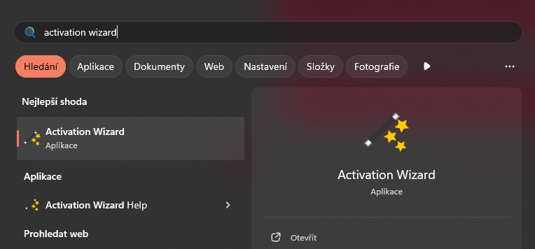 Začneme vyhledáním a spuštěním aplikace Activation wizard (průvodce aktivací).