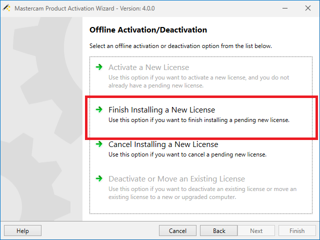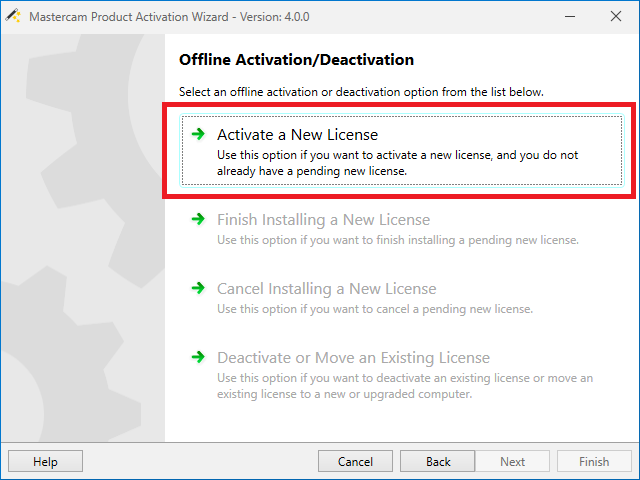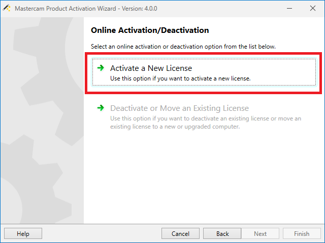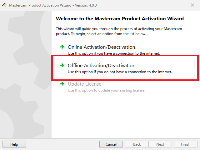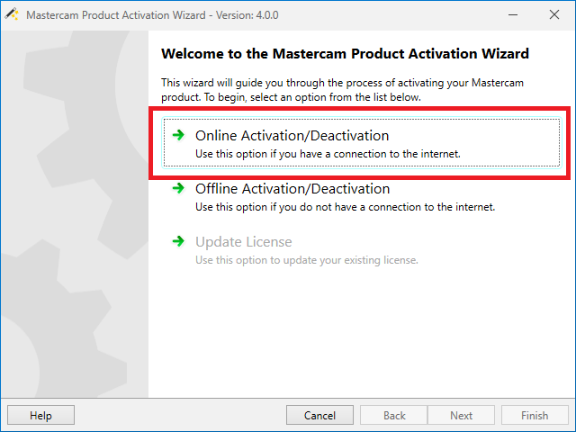 Aktivace a deaktivace se provádí pomocí aplikace Activation wizard, která je součástí instalace Mastercamu. V případě, že chybí, ji lze stáhnout v sekci Ke stažení.