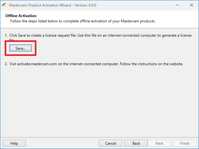 V případě, že na počítači s Mastercamem nemáme přístup k internetu, můžeme zvolit offline aktivaci a přes druhý počítač aktivovat licenční soubor online.