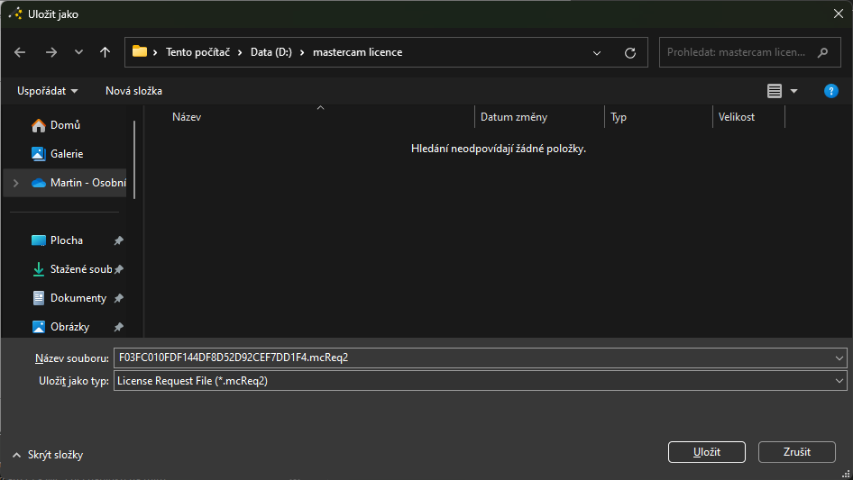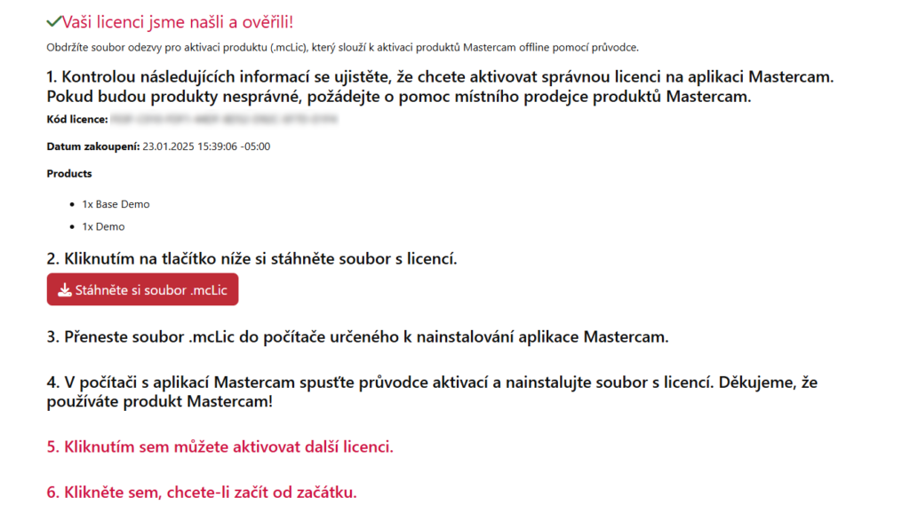 Licenci zde můžeme zkontrolovat a stáhnout aktivační soubor, který přeneseme zpátky do počítače s Mastercamem.