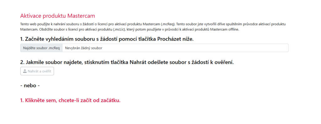 Na počítači s přístupem k internetu si otevřeme stránku activate.mastercam.com, kde vybereme aktivaci produktu a nahrajeme soubor, který jsme si před tím uložili.