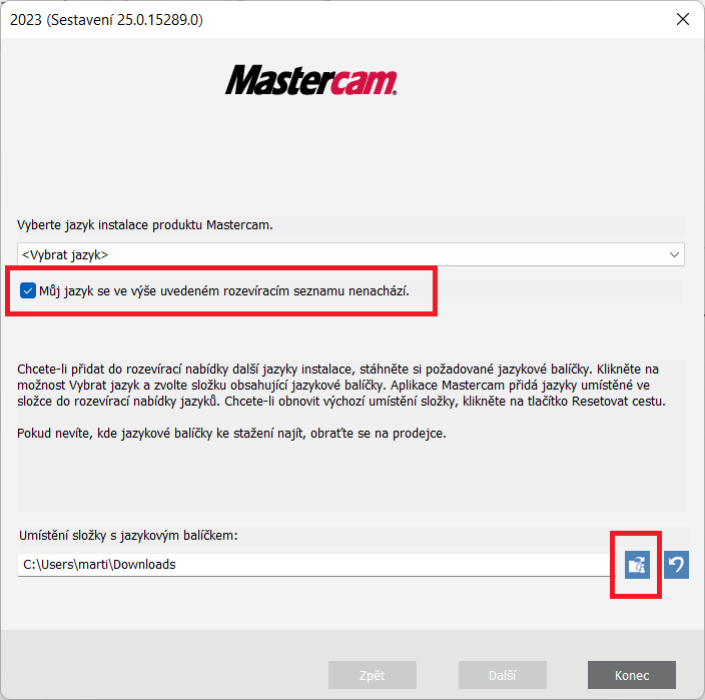 Úvodní okno instalace požaduje výběr jazyka. Pokud se v rozbalovací nabídce nenachází volba českého jazyka, zaškrtneme pole „Můj jazyk se ve výše uvedeném rozevíracím seznamu nenachází.“ a následně klikneme na tlačítko pro výběr souboru v počítači.