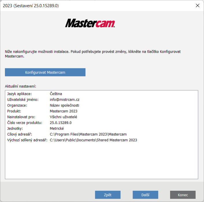 Pokud nechceme měnit nastavení umístění instalace nebo metrické jednotky na palce, pokračujeme kliknutím na tlačítko Další.